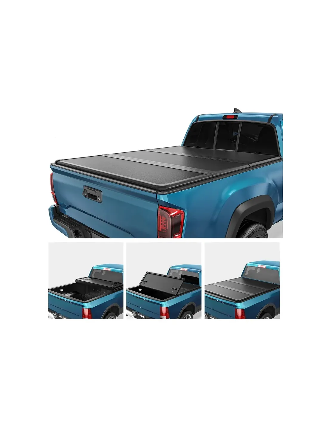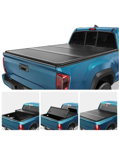 Tapa plegable dura, compuesta de 3 paneles de aluminio de alta resistencia. Diseñada para ser instalada y desinstalada en minutos, sin necesidad de herramientas. Su sistema de fijación al pickup es solo accesible una vez abierto el portalón, para máxima seguridad de la carga.