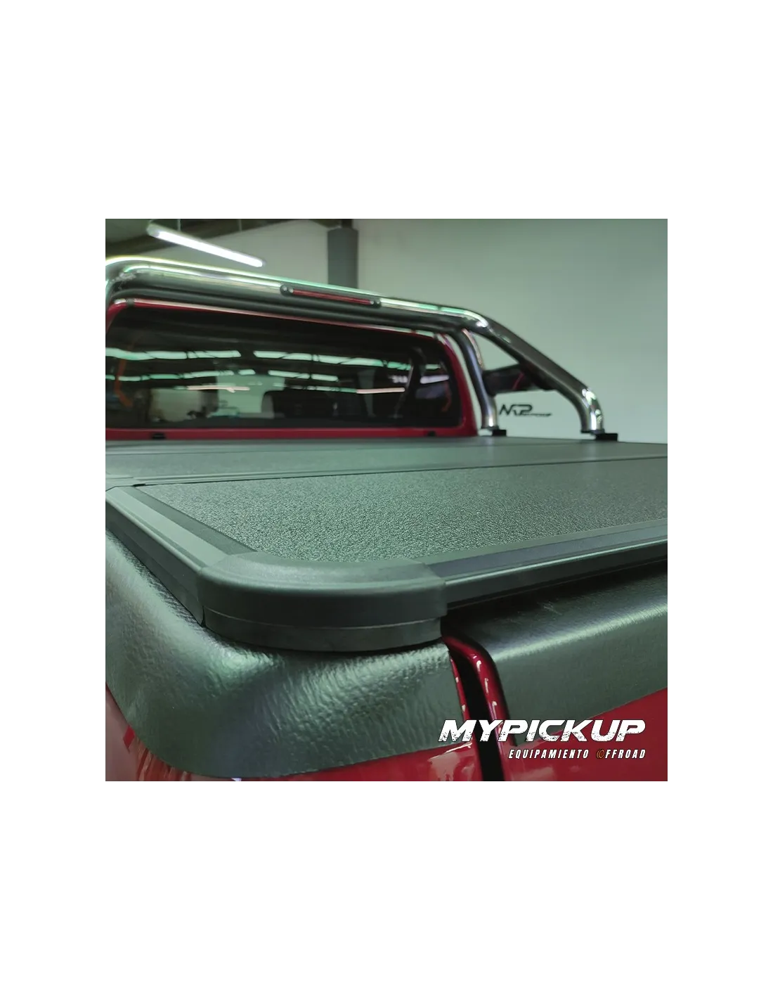 Tapa plegable dura, compuesta de 3 paneles de aluminio de alta resistencia. Diseñada para ser instalada y des-instalada en minutos, sin necesidad de herramientas. Su sistema de fijación al pickup es solo accesible una vez abierto el portalón, para máxima seguridad de la carga.