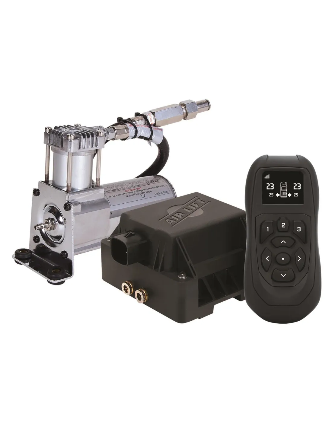 WirelessAir es un sistema de control inalámbrico de doble vía que incluye un compresor de alta resistencia. Los resortes neumáticos se controlan mediante el controlador inalámbrico o con un teléfono inteligente compatible y nuestra aplicación gratuita, y se pueden programar con hasta tres ajustes preestablecidos definidos por el usuario. WirelessAir + EZ Mount cuenta con nuestro EZ Mount, lo que permite una instalación más limpia y rápida. WirelessAir Tank + EZ Mount tiene un tanque de aire auxiliar de 2 galones para un inflado más rápido de los resortes neumáticos y menos ciclos del compresor. El kit de actualización de tanque WirelessAir mejora perfectamente un sistema de doble vía WirelessAir existente con un compresor de aire 444c y un tanque de aire auxiliar de 2 galones.
