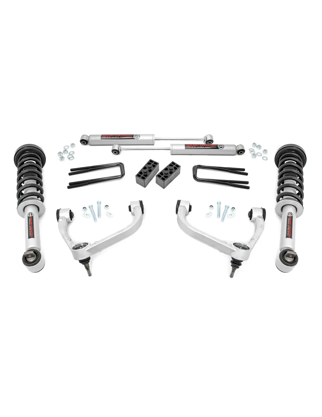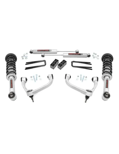 El kit de montaje atornillado de 3 pulgadas de Rough Country ofrece una instalación sencilla y una apariencia atractiva a un precio increíble. Lleve su camioneta a nuevas alturas con esta excelente opción para camionetas F-150 de 14 pulgadas en adelante. Este kit incluye un conjunto de brazos de control superiores de aluminio forjado de alta calidad diseñados para facilitar los ajustes de alineación y bujes de goma duraderos. Estos brazos están diseñados para promover una geometría similar a la de fábrica al mantener la rótula en ángulos óptimos después de la elevación. Este diseño permite un rango de movimiento mejorado y mayor de la rótula, con menos estrés, desgaste y deterioro. El kit de montaje atornillado de 3 pulgadas de Rough Country incluye puntales elevados N3 y amortiguadores cargados con nitrógeno N3, lo que le da a su camioneta una increíble calidad de manejo tanto dentro como fuera de la carretera. También se incluye un conjunto de bloques traseros para proporcionar altura de elevación en la parte trasera. Una vez instalado, este kit le da a su camioneta una gran altura de manejo para llantas de hasta 34 pulgadas al mismo tiempo que ofrece una apariencia limpia y nivelada de adelante hacia atrás. Conserve las ruedas de serie con este kit cuando utilice el espaciador de rueda de 0,25 pulgadas de Rough Country. Este kit todo incluido viene con todo lo que necesita y la instalación es muy sencilla en comparación con otros kits del mercado. Este kit, que cuenta con un proceso de instalación 100 % atornillable que no requiere cortes ni perforaciones, se puede instalar con herramientas comunes en un garaje doméstico y permite devolver la camioneta a su estado original en cualquier momento si así lo desea. Lo mejor de todo es que este kit cuenta con la garantía de reemplazo de por vida de Rough Country.