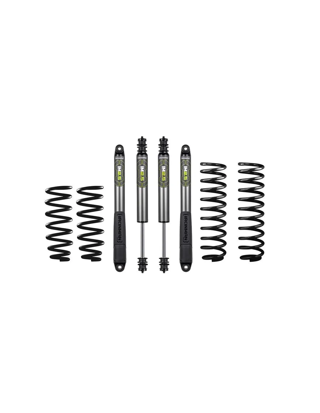 Los kits de suspensión Ironman 4x4 incluyen amortiguadores delanteros y t.raseros, junto con espirales reforzados (y/o ballestas según modelo), diseñados para elevar tu vehículo en torno a 2” y mejorar tanto el confort como el rendimiento en terrenos exigentes.
