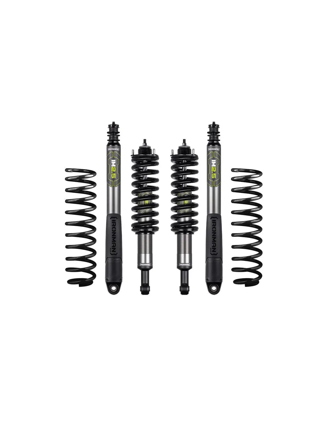 Los kits de suspensión Ironman 4x4 incluyen amortiguadores delanteros y traseros, junto con espirales reforzados (y/o ballestas según modelo), diseñados para elevar tu vehículo en torno a 2” y mejorar tanto el confort como el rendimiento en terrenos exigentes.